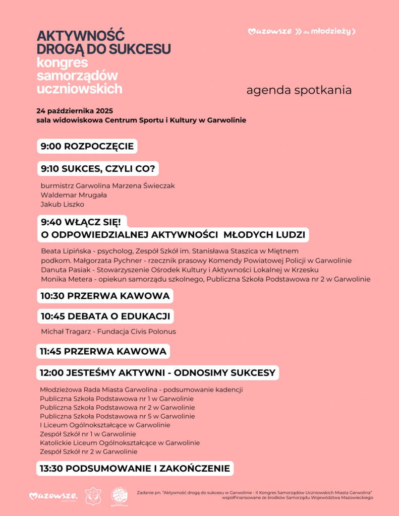 Wydarzenie „Aktywność drogą do sukcesu w Garwolinie – II Kongres Samorządów Uczniowskich Miasta Garwolina” współfinansowane jest ze środków Samorządu Województwa Mazowieckiego.