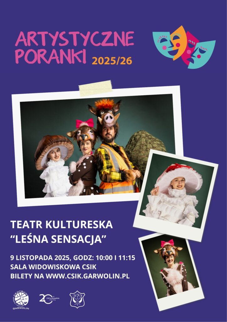 Teatr Kultureska odwiedza garwolińską publiczność od kilku lat i nigdy nie zawodzi! Najmłodsi widzowie mieli już okazję zobaczyć w Centrum Sportu i Kultury takie przedstawienia jak “Granie na straganie”, “Zielony Kopciuszek” czy “Detektyw Kot”. Tym razem, w ramach Artystycznych Poranków, aktorzy pokażą nam coś zupełnie nowego. “Leśna Sensacja” to sensoryczny spektakl muzyczny o tematyce ekologicznej. Wykorzystywane są w nim naturalne instrumenty muzyczne oraz realne dźwięki lasu! Widowisko wspiera rozwój dzieci poprzez zabawę, sensorykę muzyczną, ćwiczenia koordynacji wzrokowo-ruchowej, a także możliwość interakcji z aktorami. Zawiera liczne treści wychowawcze. Uczy dzieci empatii, wybaczania i uwrażliwia na potrzeby innych oraz środowiska.